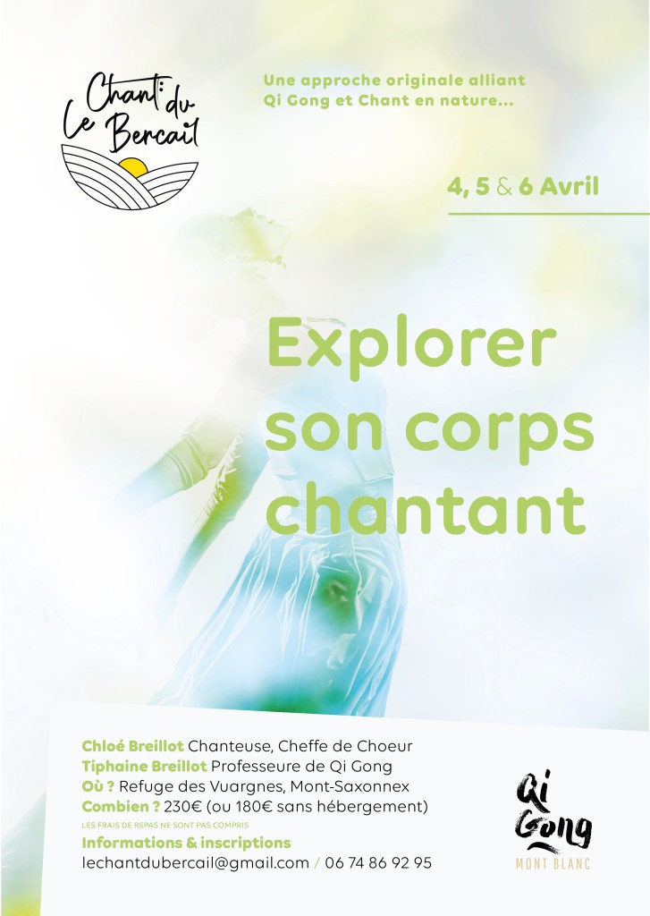 Nous serons en immersion dans un très beau cadre ressourçant. Nous créons alors les conditions favorables ensemble pour chanter. À la fois en lien avec la nature qui nous entoure mais également grâce à la pratique du Qi Gong qui nous prépare au chant : meilleure perception des sensations corporelles et écoute nécessaire pour la polyphonie notamment.